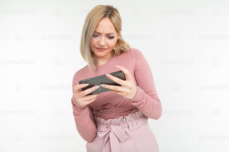 Кавказская блондинка в розовой одежде играет по телефону в горизонтальном формате на белом фоне