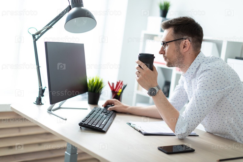 Молодой человек в очках стоит возле стола в офисе, держит в руке стакан кофе и работает за компьютером