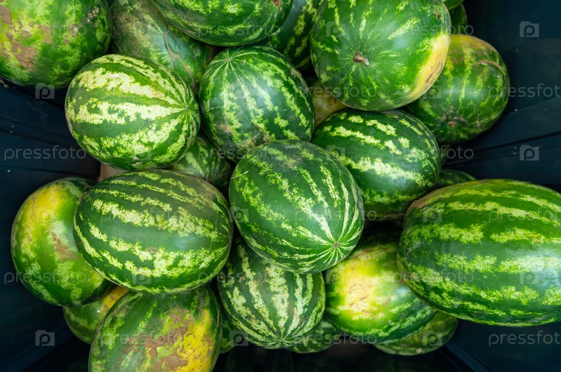 Полосатый спелый арбуз на фоне фермерского рынка или продуктового магазина с высоты птичьего полета