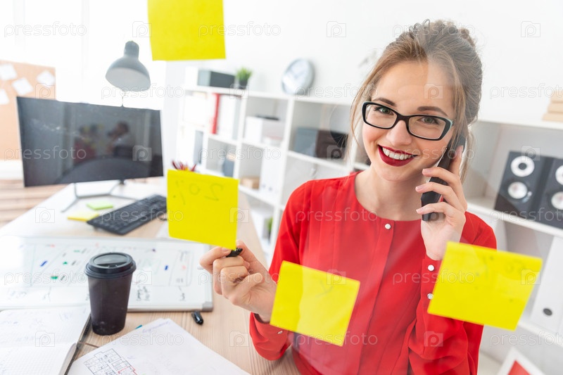 Молодая девушка стоит возле прозрачной доски с наклейками и держит маркер и телефон