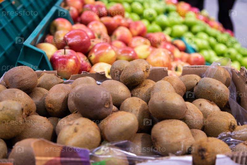 Различные фрукты в отдельных коробках. Киви, зеленые яблоки, красные яблоки. Для фона, крупным планом
