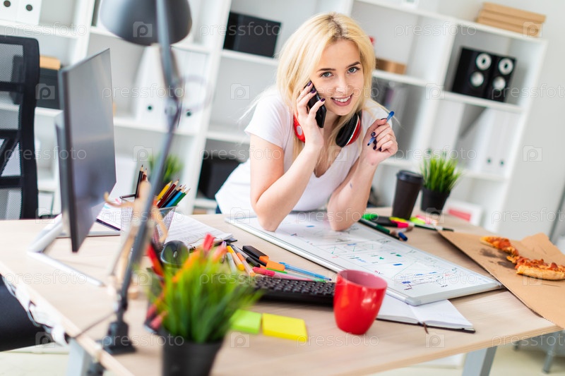 Молодая девушка стоит возле стола, разговаривает по телефону и держит в руке маркер. На столе магнитная доска. На шее у девушки висят наушники