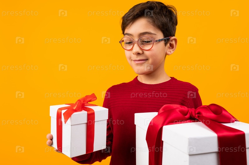 Улыбающийся кавказский мальчик в красном джемпере с двумя подарочными коробками на желтом фоне с копией пространства