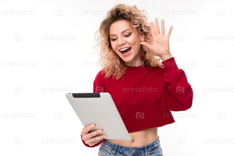 Смеющаяся блондинка с планшетом в руках на белом фоне