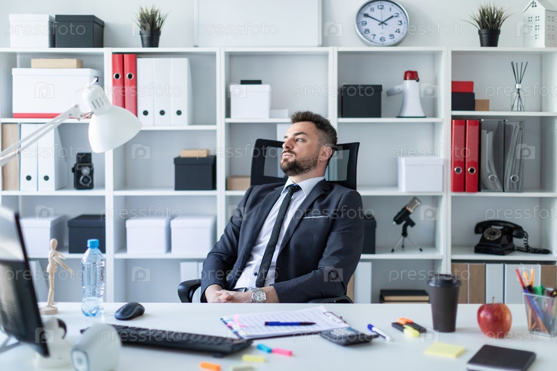 Бородатый мужчина в деловом костюме работает в светлом офисе. фото с глубиной резкости