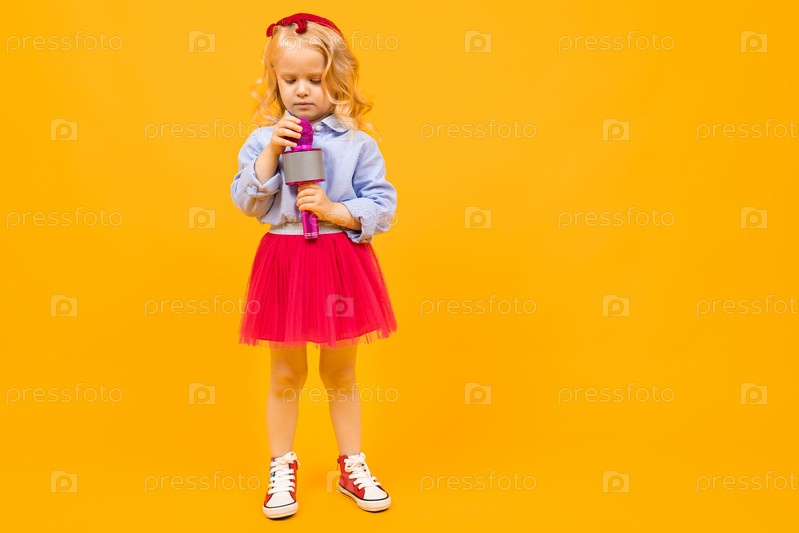 Портрет красивой кавказской девушки с длинными светлыми волосами, красивое лицо в платье радуется и играет с микрофоном