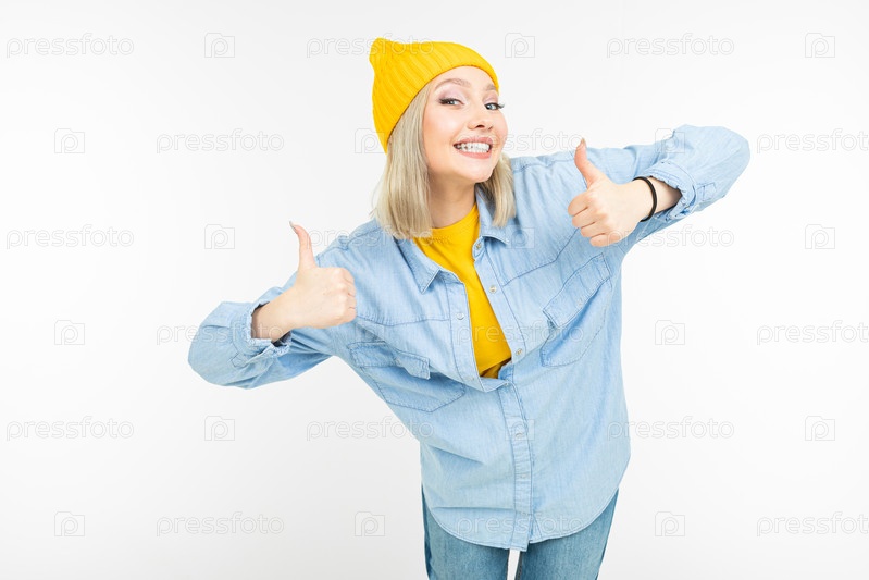 Блондинка в стильной джинсовой рубашке и желтой шляпе выглядит как на белом фоне студии