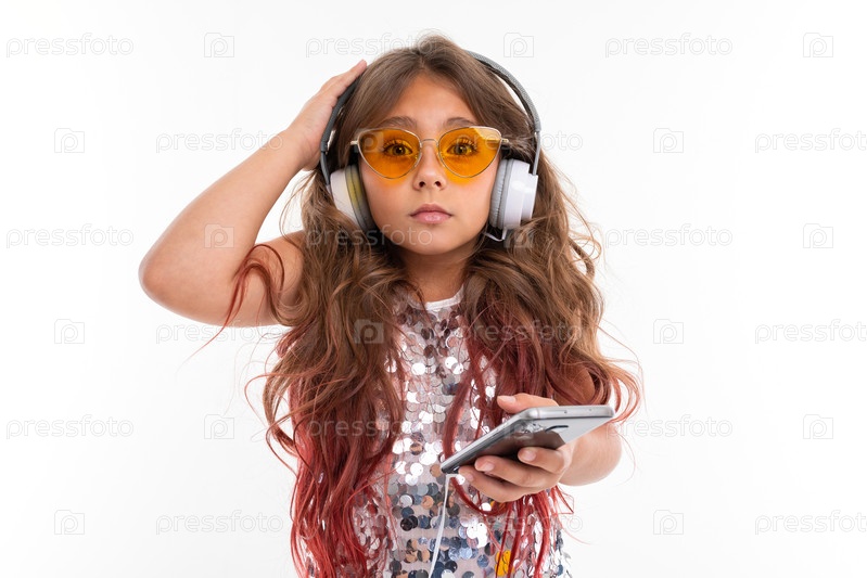 Девушка в наушниках задает вопрос на белом фоне