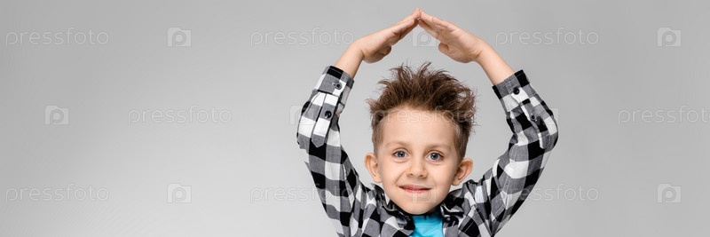 Очаровательный счастливый ребенок на сером фоне. Волосы мальчика подняты. У мальчика прическа. Мальчик рисует руками крышу