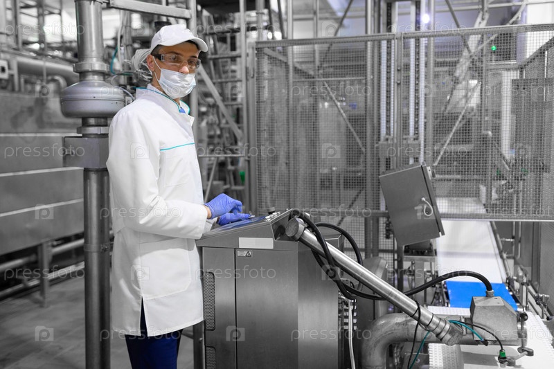 Сосредоточенный технолог делает необходимые записи с помощью цифрового планшета, стоя в производственном цехе молочного завода. Инспектор осуществляет контроль на сыроварне