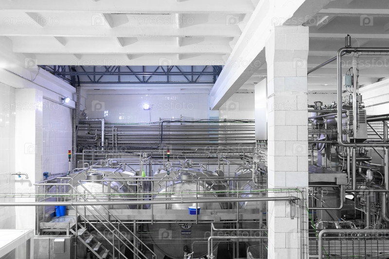 Промышленный фон. Оборудование, промышленные инструменты и машины для производства в заводских цехах. молочный завод. Стальной водопровод, хромированные трубы. Внутри современного винного завода. Современный заводской интерьер