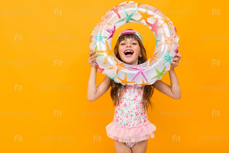 Милая девушка в купальнике с плавательным кругом на желтом фоне