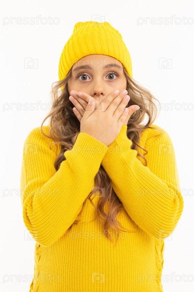 Счастливая кавказская девушка в желтой шляпе и капюшоне удивлена изолированным на белом фоне