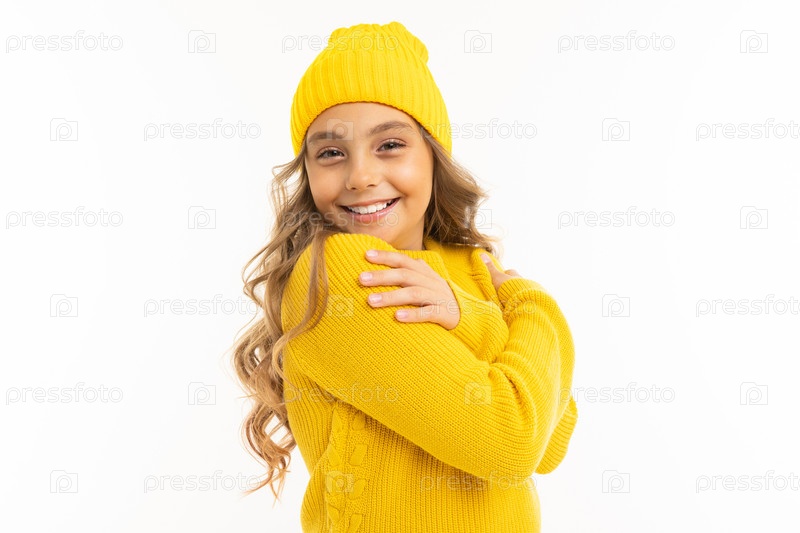 Счастливая кавказская девушка в желтой шляпе и капюшоне улыбается и радуется на белом фоне