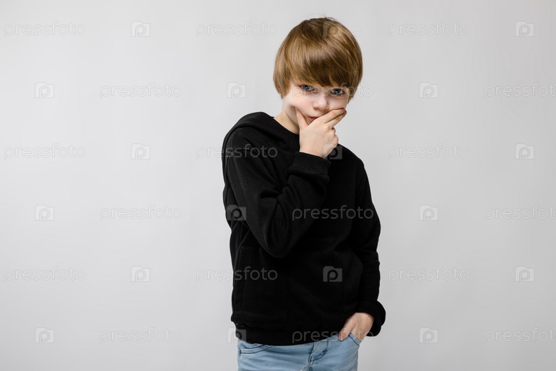 Портрет очаровательного уверенного в себе маленького мальчика, стоящего в студии с рукой возле лица с рукой в кармане на сером фоне