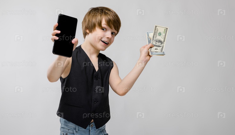 Портрет очаровательного смешного взволнованного маленького мальчика, стоящего в студии с мобильным телефоном и деньгами в руках на сером фоне
