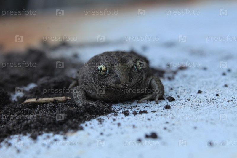 Жаба-лягушка на белом светлом фоне на земле сидит крупным планом. земноводные забавные животные