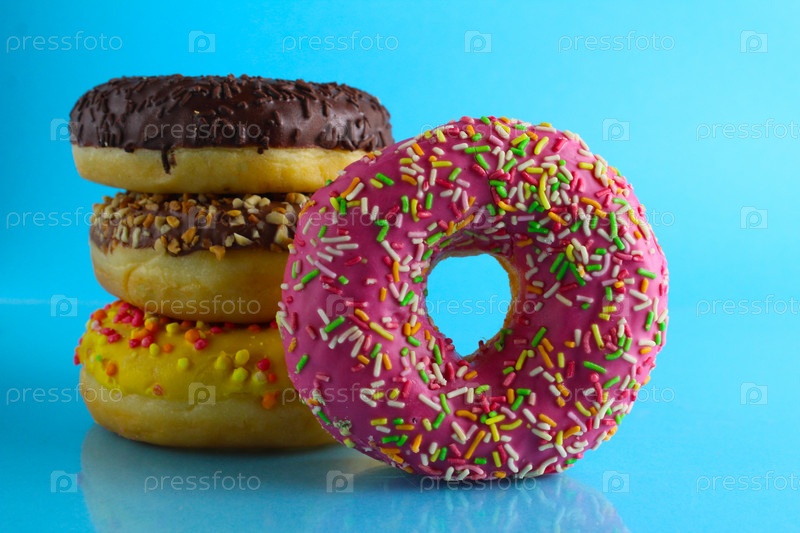 Натюрморт с пончиками в розовой глазури с цветными подставками для пончиков на синем ярком фоне