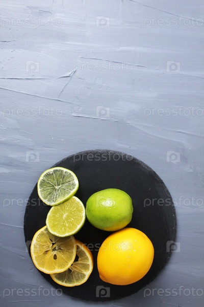 Натюрморт цитрусовые апельсин лимон лайм лежат на подносе на сером фоне с местом для текста. Фрукты приносят пользу витаминами приготовления кислой воды. витамины для здоровья. Польза фруктов