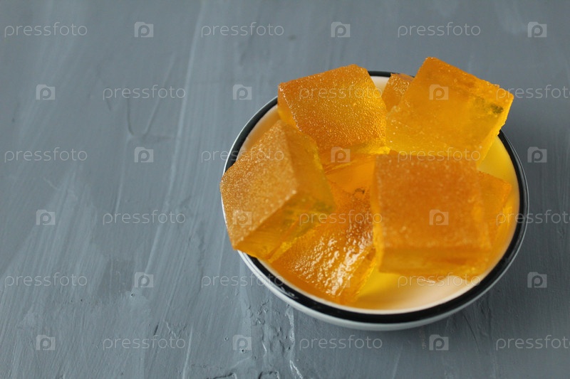 Оранжевый апельсиновый мармелад в миске на сером фоне со смесью для текста. полезный десерт на агаре. Апельсиновые кубики, кусочки мармелада
