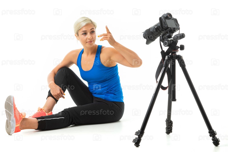 Молодая спортивная девушка со светлыми волосами сидит перед камерой и показывает, как делать упражнения