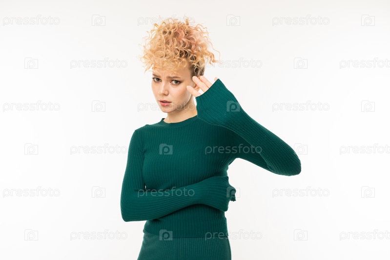 Портрет красивой кавказской женщины в зеленом платье жестикулирует на белом фоне