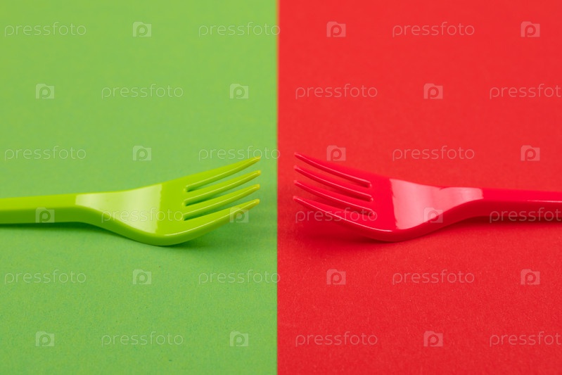 Пара пластиковых вилок красного и зеленого цветов на заднем плане