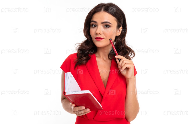 Умная брюнетка в красном платье на фоне белой стены с блокнотом в руках
