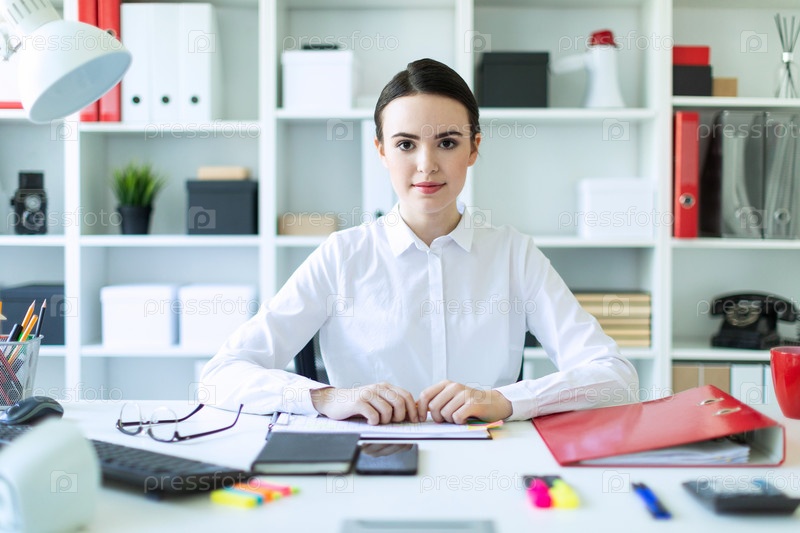 Молодая девушка в офисе сидит за столом и держит в руках ручку
