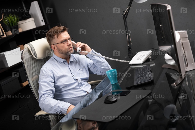 Серьезный бизнесмен, работающий в офисе за компьютерным столом и разговаривающий по стационарному телефону