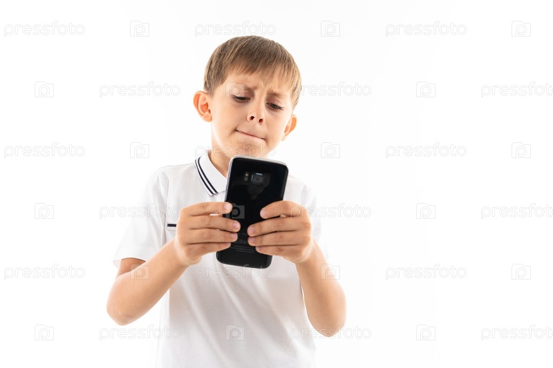 Маленький мальчик в белой рубашке, синих шортах со светлыми волосами, в черных очках с телефоном