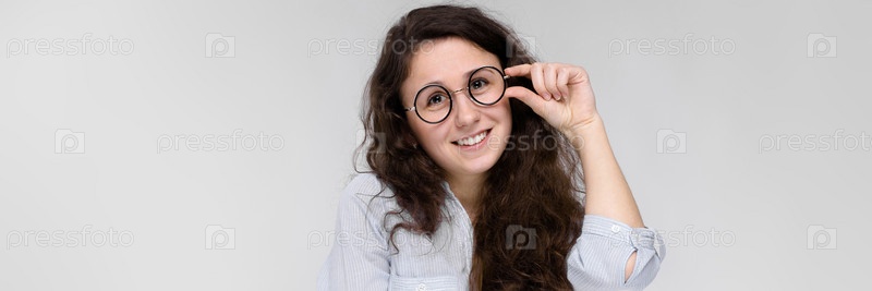Портрет молодой девушки в очках. Красивая молодая девушка на сером фоне. Молодая девушка в светлой блузке и темных брюках