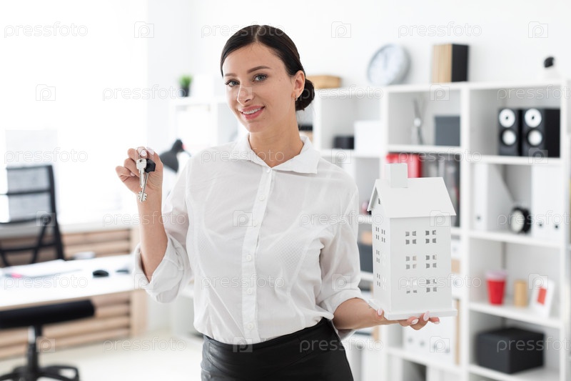 Молодая девушка стоит в офисе и держит ключи и макет дома