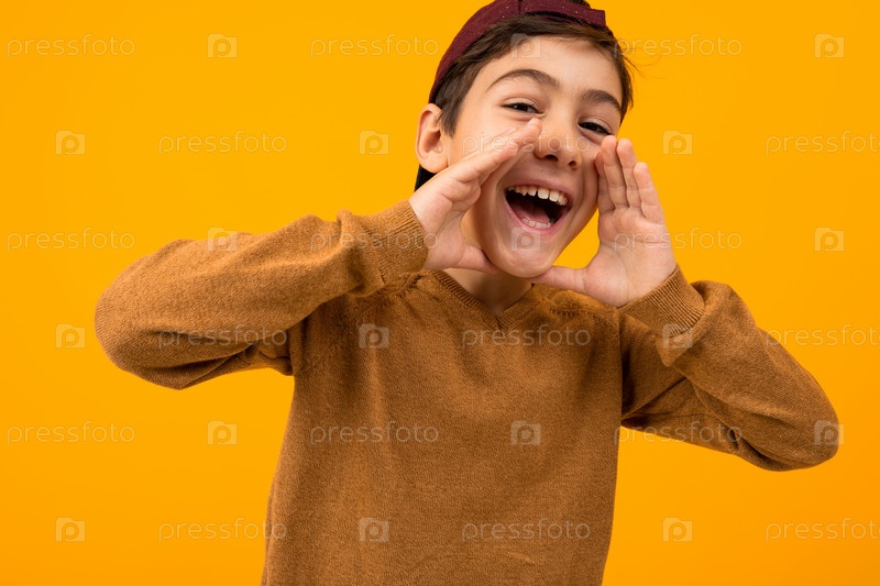 Привлекательный мальчик, кричащий крупным планом на желтом фоне студии