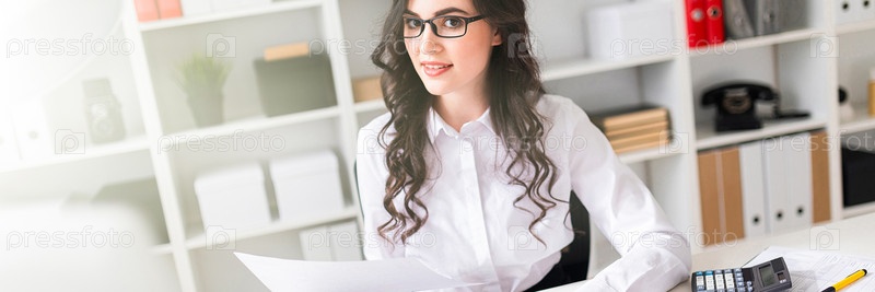 Молодая девушка работает за компьютером в офисе и держит в руке ручку и блокнот