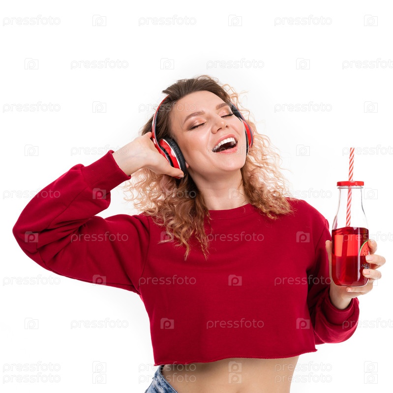 Красивый молодой студент слушает музыку в наушниках и наслаждается