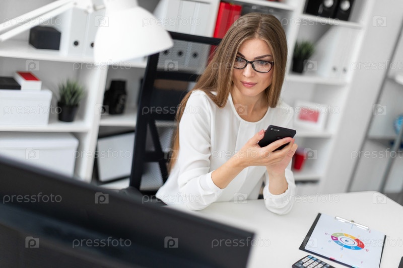 Молодая девушка сидит за столом в офисе и держит телефон