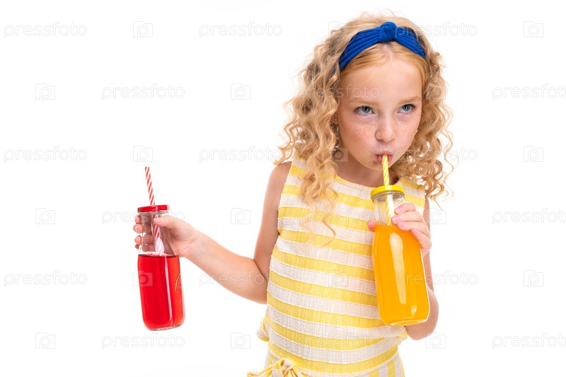 Маленькая девочка с рыжими волосами в бело-желтом полосатом летнем костюме, с синей повязкой на голове пьет апельсиновый сок из стеклянной бутылки с трубкой и хранит арбузный сок