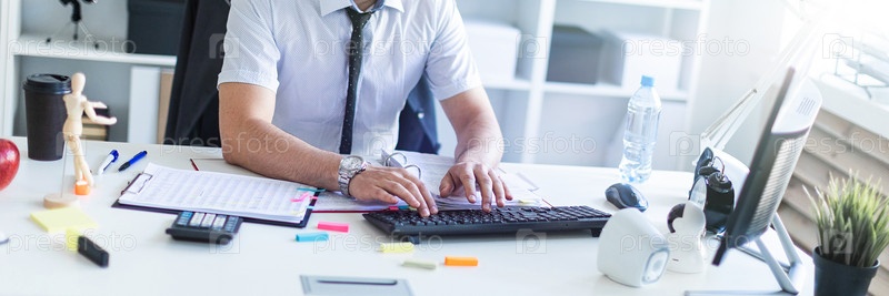 Мужчина сидит за столом в офисе, работает с документами и компьютером