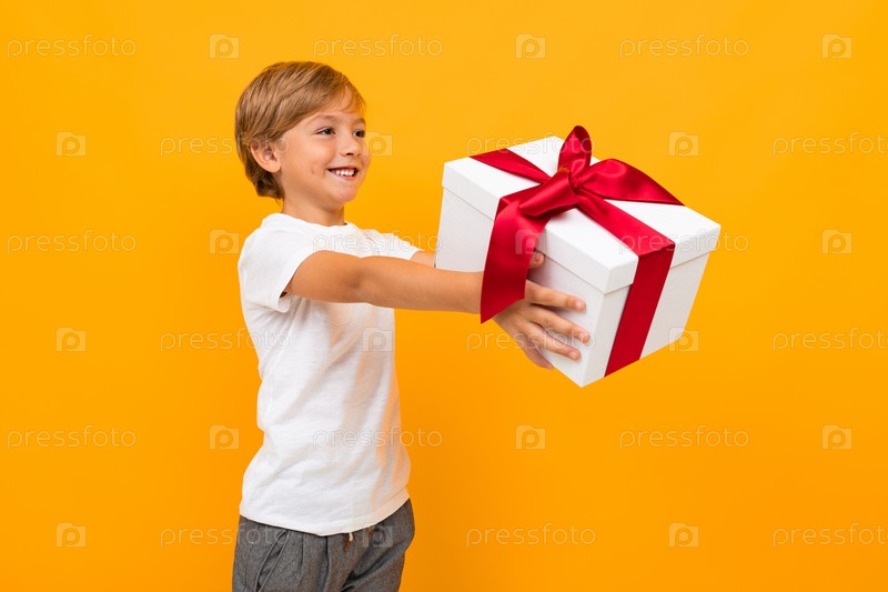 Концепция дня святого валентина. привлекательный мальчик протягивает коробку с подарком с красной лентой на ярко-желтом фоне