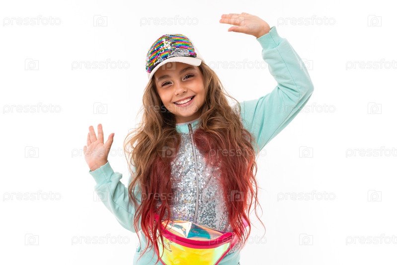 Маленькая красивая кавказская девушка в спортивном костюме улыбается, фотография на белом фоне