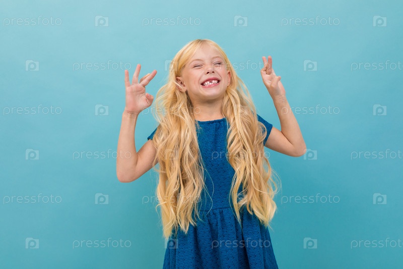 Маленькая кавказская девочка в голубом платье с длинными светлыми волосами на синем фоне