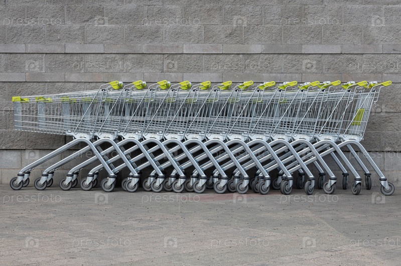 Многие продуктовые тележки с желтыми ручками стоят в ряд в центре фото на фоне серого кирпича парковки супермаркета