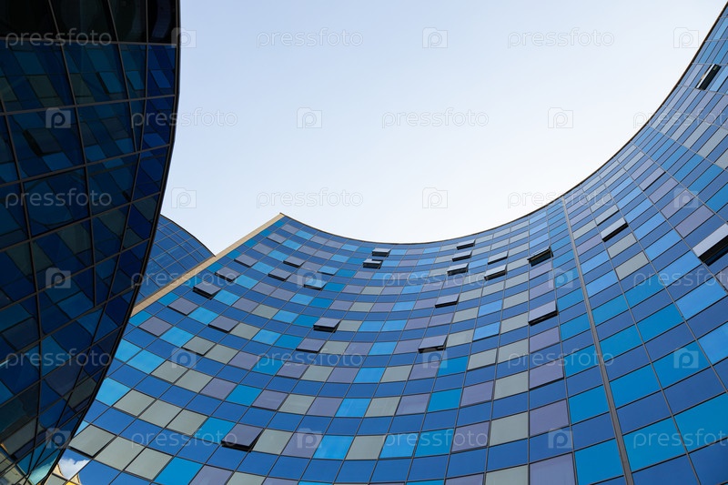 Вид с земли на голубую стеклянную поверхность полукруглой стены здания, отражающую голубое небо