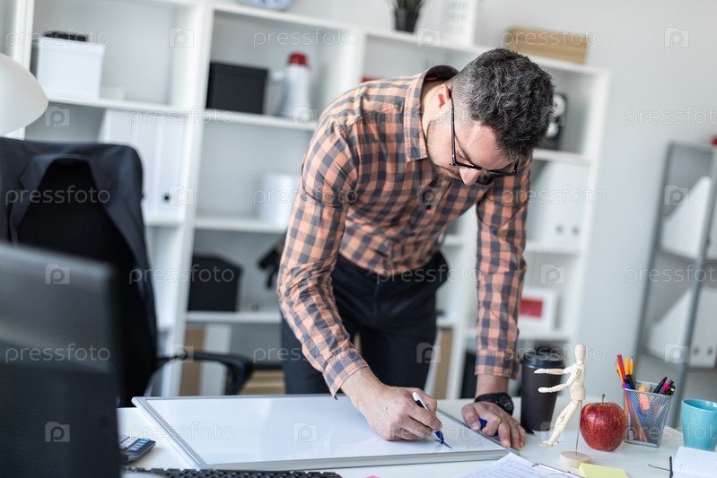 Мужчина в офисе стоит возле стола и рисует маркером на магнитной доске
