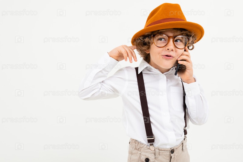 Красивый мальчик с вьющимися волосами в белой рубашке, коричневой шляпе, очках с черными подтяжками звонит по телефону на белом фоне