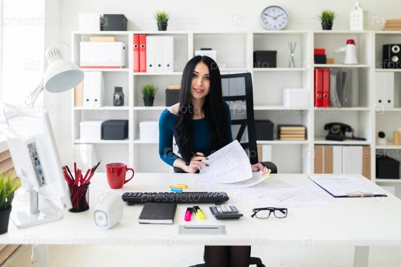 Молодая девушка сидит в офисе за столом, держит в руке ручку и заполняет документы