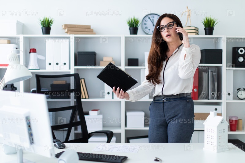 Молодая девушка стоит возле стола и разговаривает по телефону