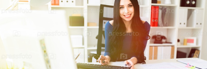 Молодая девушка сидит в офисе за столом и печатает текст на клавиатуре