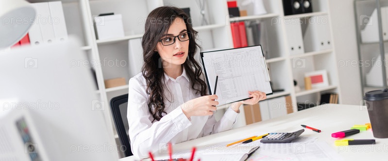 Красивая молодая девушка сидит за столом в офисе и указывает карандашом на информацию в документе